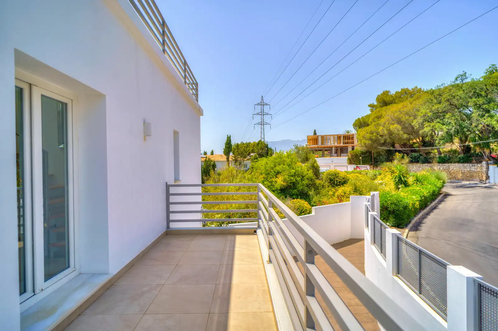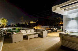The villa also enjoys a large upper terrace with Jacuzzi, chill out and panoramic views of the sea and the mountains.