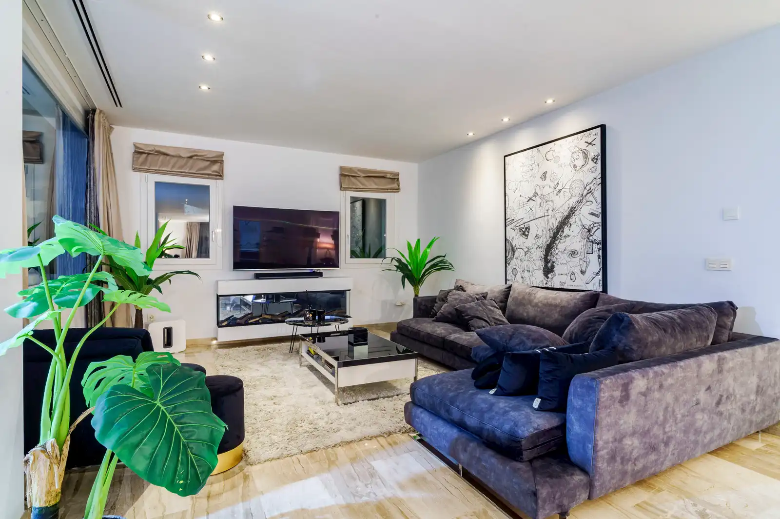 Entering the main floor level, we discover a large open living and dining area with an adjacent fully-fitted kitchen, one guest bedroom en suite, guest toilet and a stunning outdoor terrace with unbeatable sea views.