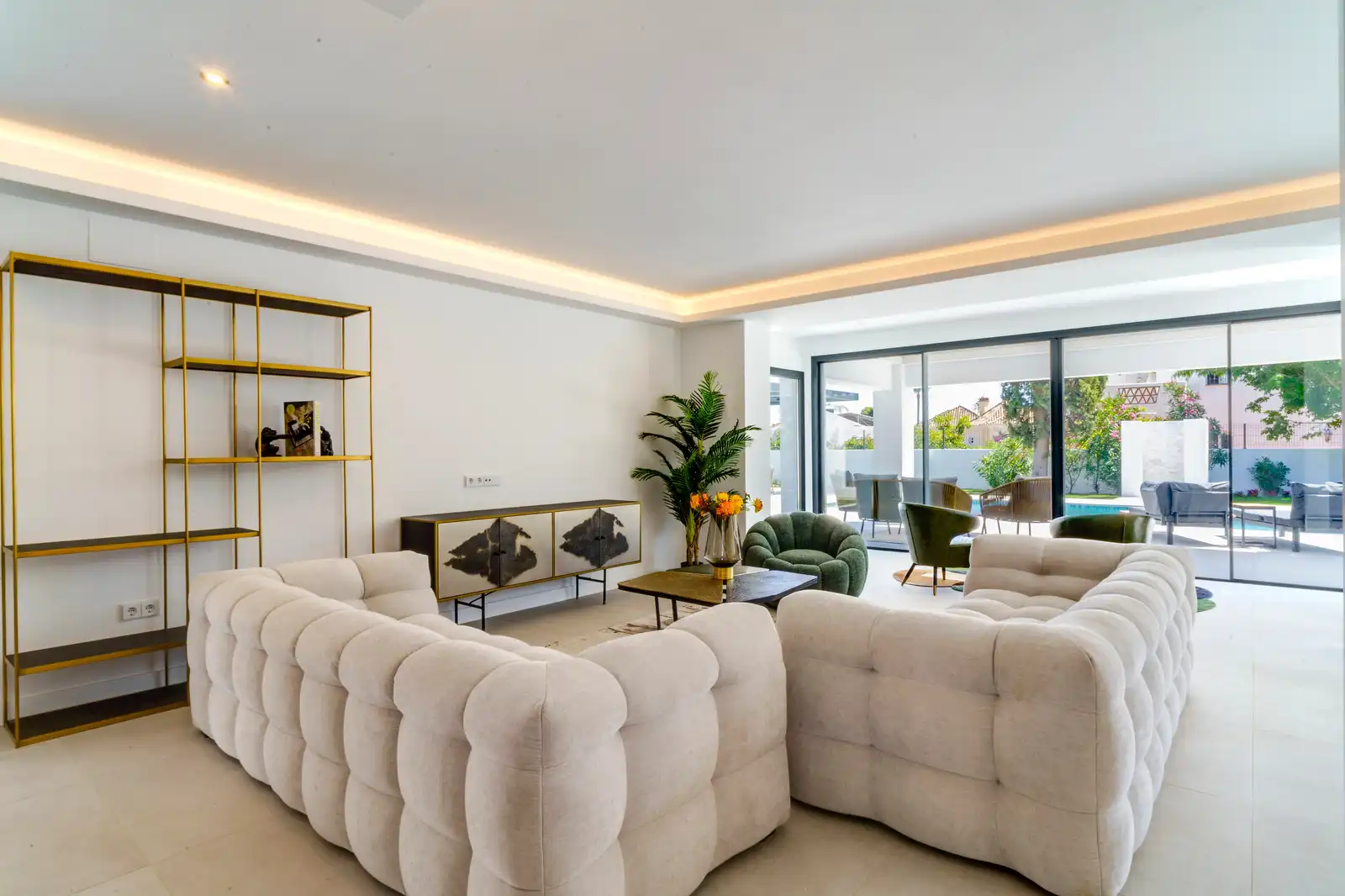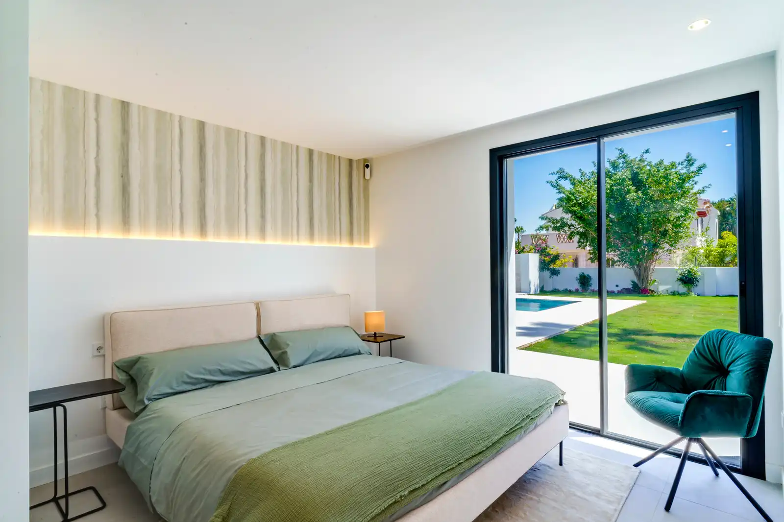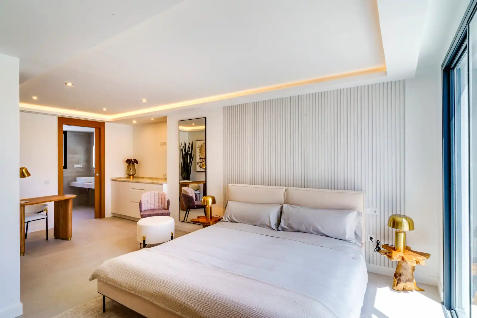 The left side of the living room has a private door towards the Master Bedroom space with its big bathroom en-suite and direct access to the garden, pool and the stairs of the solarium.