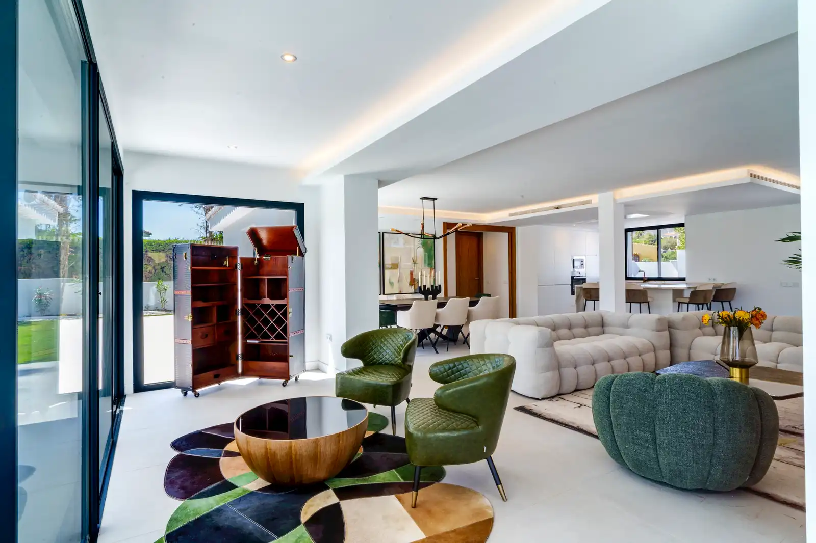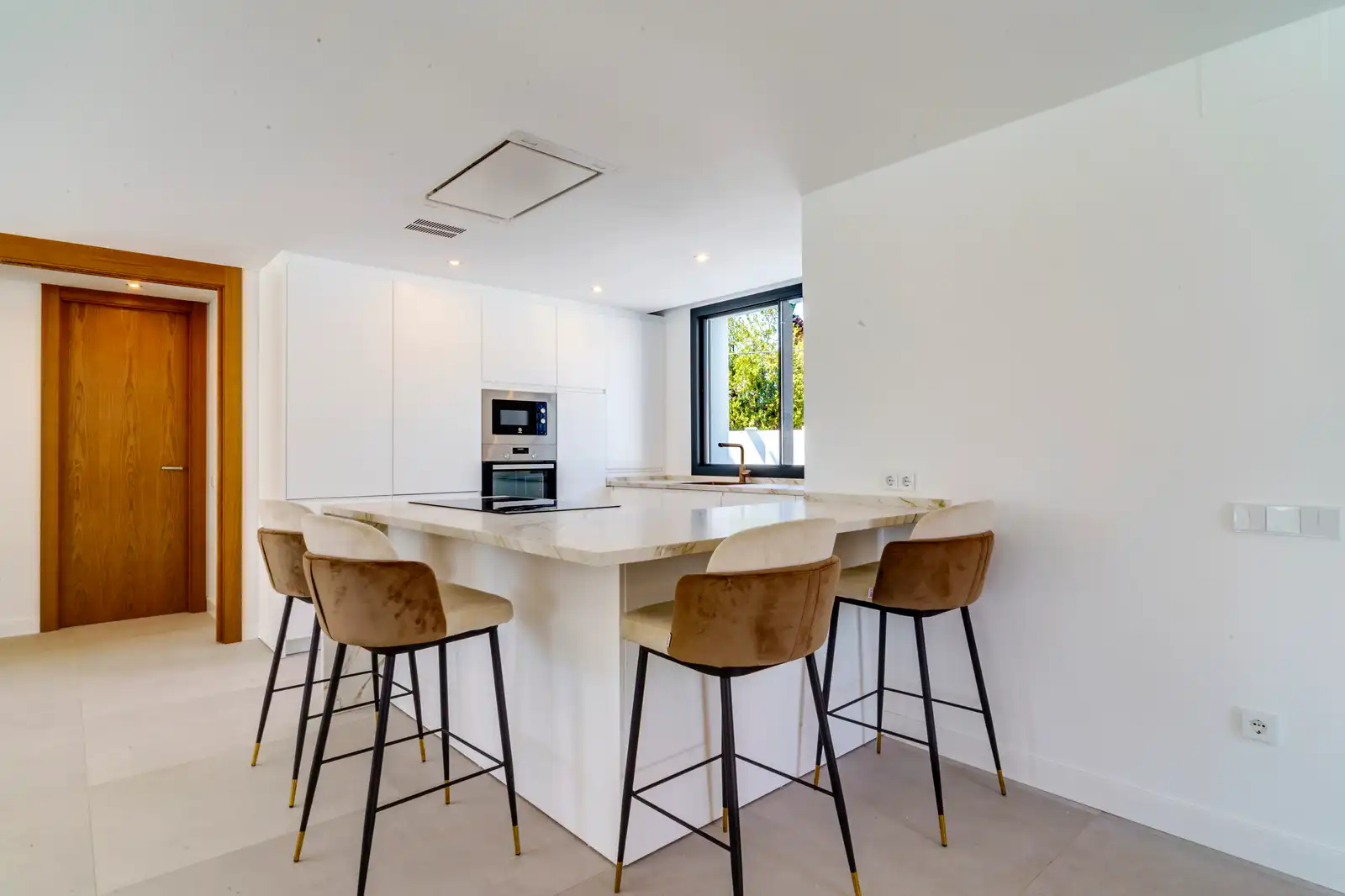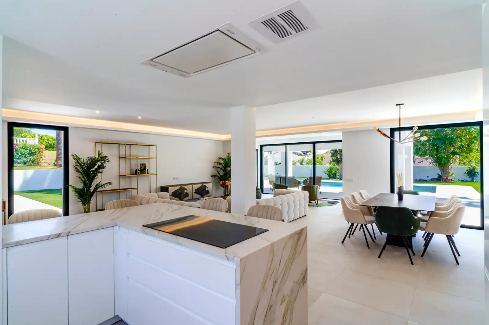 We start with a cozy entrance hall, guest toilet, an open-plan fully equipped island kitchen with breakfast bar with seating, dining room and salon area with a terrace towards the pool and garden zone.
