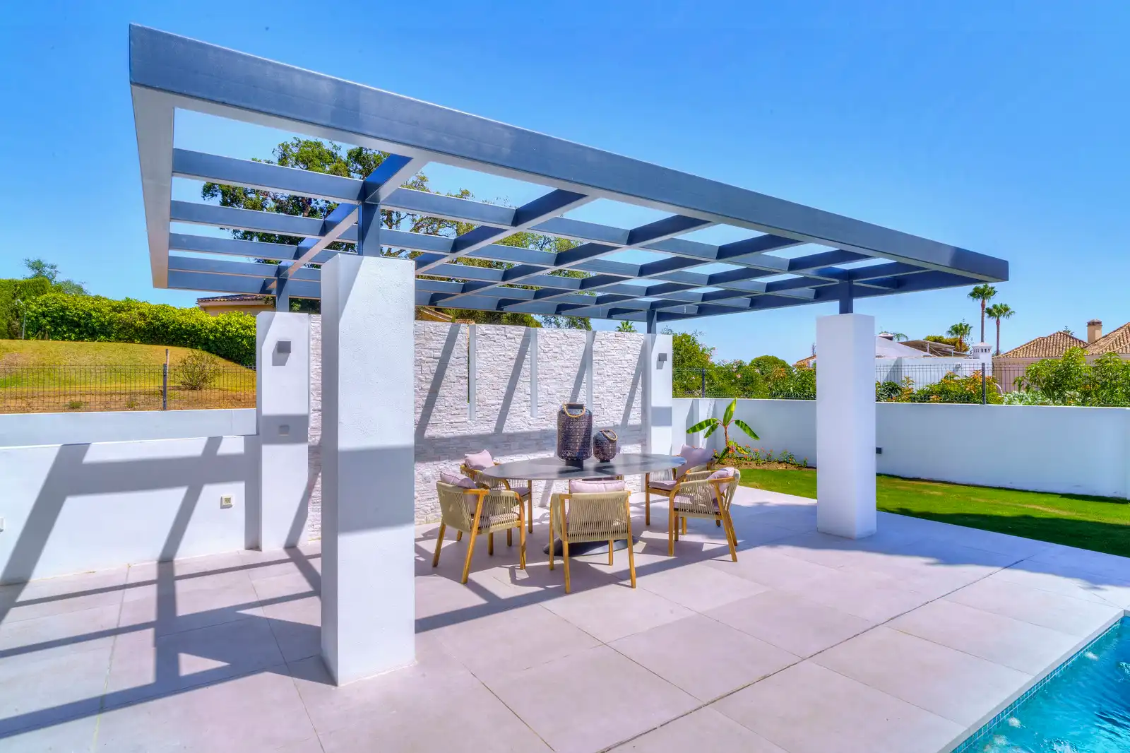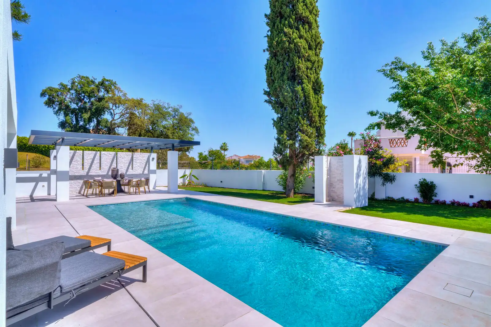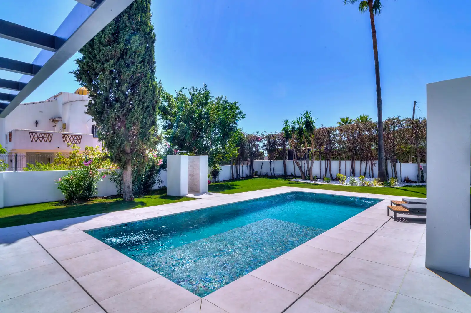 The outdoor space offers a beautiful swimming pool with space for sunbeds in the water, a fully private and manicured garden with flowers and trees, solarium area on top of the studio apartment and a large entertainment pergola with sitting area.